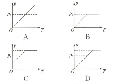 10. (2025·南昌师范大学附属中学模拟)如图所示,一汽缸固定在水平地面上,用活塞封闭着一定质量的理想气体。已知汽缸不漏气,活塞移动过程中与汽缸内壁间无摩擦。初始时,外界大气压强为$p_0$,活塞对小挡板的压力刚好等于活塞的重力。现缓慢升高汽缸内气体的温度,则能反映汽缸内气体的压强$p$随热力学温度$T$变化的图像是(