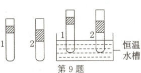 9.C 解析:两部分气体都进行等压变化,根据盖-吕萨克定律有$\frac{V}{T_{1}}=\frac{V'}{T_{2}}=\frac{\Delta V}{\Delta T},$对气柱1,则$\Delta V_{1}=\frac{\Delta T}{T_{1}}V_{1},$对气柱2,则$\Delta V_{2}=\frac{\Delta T}{T_{1}}V_{2},$因$V_{1} > V_{2},$可得$\Delta V_{1} > \Delta V_{2},$选项C正确。