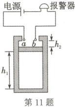 11. (选做题)(2024·江西上饶二模)小美设计了一温度报警装置,原理图如图所示,竖直放置的导热汽缸内用质量$m = 0.25\mathrm{kg}$、横截面积$S = 5 × 10^{-5} \mathrm{m^2}$、上表面涂有导电物质的活塞封闭一定质量的理想气体。当缸内气体的温度$T_1 = 300\mathrm{K}$时,活塞下表面与汽缸底部的距离$h_1 = 6\mathrm{cm}$,上表面与$a$、$b$两触点的距离$h_2 = 1\mathrm{cm}$。当环境温度上升,活塞缓慢上移至卡口处时恰好触发报警器报警。不计一切摩擦,大气压强恒为$p_0 = 1.0 × 10^5 \mathrm{Pa}$,重力加速度$g$取$10\mathrm{m/s^2}$。求: