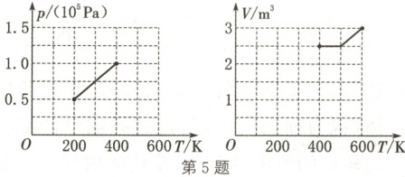 (1)由题图知,$p_1=1.0×10^5Pa$,$V_1=2.5m^3$,$T_1=400K$,$V_2=3m^3$,$T_2=600K$,由理想气体状态方程$\frac{p_1V_1}{T_1}=\frac{p_2V_2}{T_2}$,解得$p_2=1.25×10^5Pa$。