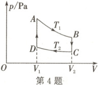 4. (2024·江西卷)可逆斯特林热机的工作循环如图所示。一定质量的理想气体经$ABCDA$完成循环过程,$AB$和$CD$均为等温过程,$BC$和$DA$均为等容过程。已知$T_1 = 1200 K$,$T_2 = 300 K$,气体在状态$A$的压强$p_A = 8.0 × 10^5 Pa$,体积$V_1 = 1.0 m^3$,气体在状态$C$的压强$p_C = 1.0 × 10^5 Pa$。求: