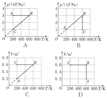 2. (2025·山东省济南第一中学期中)(多选)某同学利用DIS实验系统研究一定质量理想气体的状态变化,实验后计算机获取的$p - V$图像如图所示,已知气体在状态$B$的温度$T_B = 600 K$。如将上述变化过程的图像改为$p - T$图像或$V - T$图像,下列图像正确的是 (