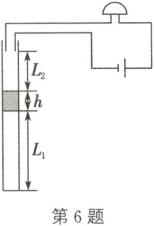 6. (2025·湖南岳阳市第一中学期末)如图所示为一简易火灾报警装置,其原理是竖直放置的试管中装有水银,当温度升高时,水银柱上升,使电路导通,蜂鸣器发出报警的响声。已知温度为$27\degree C$时,封闭空气柱(视为理想气体)长度$L_1$为$20 cm$,此时水银柱上表面与导线下端的距离$L_2$为$10 cm$,水银柱的高度$h$为$5 cm$,大气压强为$75 cmHg$,取$T = t + 273 K$。