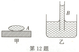 12. (多选)同一种液体,滴在固体$A$的表面时,出现如图甲所示的情况;当把毛细管$B$插入这种液体时,液面又出现如图乙所示的情况。若固体$A$和毛细管$B$很干净,则