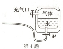 4. (2024·广东肇庆期末)常见的气压式水枪玩具内部原理如图所示。从储水罐充气口充入气体,达到一定压强后,关闭充气口。现将阀门$M$打开,水立即从枪口喷出。若在水快速喷出的过程中,罐内气体(可视为理想气体)来不及与外界达到热平衡,则喷