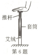6.D 解析:猛推推杆压缩筒内气体,气体未来得及与外界发生热交换,即$Q = 0$,气体被压缩,体积减小,则外界对气体做正功,即$W>0$,根据热力学第一定律$\Delta U = Q + W$可知,气体内能增大,选项C错误;气体内能增大,其温度升高,气体体积减小,根据理想气体状态方程$\frac{pV}{T} = C$,则气体压强增大,选项A错误;气体被压缩,体积减小,则气体对外界做负功,选项B错误;气体温度升高,则分子平均动能增大,选项D正确。