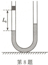 8. (2025·山西吕梁模拟)如图所示,一竖直放置的U形玻璃管,横截面积$S = 5.0cm^{2}$,其右端开口,左端用光滑活塞和水银封闭一段长为$L_{0}$、温度$t_{0} = 27° C$的空气柱(可视为理想气体),右侧水银面比左侧的水银面高$20cm$。现将封闭气体的温度缓慢降至$t_{1} = - 3° C$,此时封闭空气柱长$L = 36cm$。已知降温过程中封闭气体的内能减少了$2J$,外界大气压$p_{0} = 1.0 × 10^{5}Pa$,水银的密度$\rho = 13.6 × 10^{3}kg/m^{3}$,重力加速度$g$取$10m/s^{2}$,求:(取$T = t + 273K$)