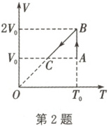 2. 一定质量的理想气体体积 $V$ 与热力学温度 $T$ 的关系图像如图所示,气体在状态 $A$ 时的压强 $p_A = p_0$,温度 $T_A = T_0$,线段 $AB$ 与 $V$ 轴平行,$BC$ 的延长线过原点。求: