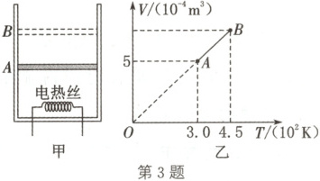 现通过电热丝缓慢加热气体,直到活塞缓慢到达新的位置 $B$,在此过程中,缸内气体的 $V-T$ 图像如图乙所示。已知大气压强 $p_0 = 1.0 × 10^5\ Pa$,忽略活塞与汽缸壁之间的摩擦,重力加速度 $g$ 取 $10\ m/s^2$。
