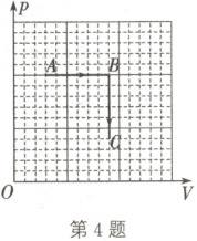 4. B 解析:从状态 A 到状态 B,气体压强不变,体积变大,所以气体对外做功,W<0,根据\frac{V_A}{T_A}=\frac{V_B}{T_B},可知温度升高,所以内能变大,ΔU>0,根据热力学第一定律ΔU=Q+W,可得 Q>0,从状态 A 到状态 B,气体吸收热量,选项 A 错误;从状态 B 到状态 C,气体发生等容变化,压强减小,根据$\frac{p_B}{T_B}=\frac{p_C}{T_C},$可知从状态 B 到状态 C 气体温度降低,根据热力学第一定律ΔU=Q+W,可知气体向外界放出热量,选项 B 正确;根据上述分析可知状态 B 的内能大于状态 A、C 的内能,则可知气体在状态 A 和状态 C 的温度都小于状态 B 的温度,选项 CD 错误。