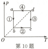 10. (2025·河南名校联盟联考)如图所示,一定质量的理想气体从状态 $a$ 依次经过一系列的变化过程回到状态 $a$。已知 $ad$ 和 $bc$ 与 $T$ 轴平行,$ab$ 和 $cd$ 与 $p$ 轴平行,$bd$ 的延长线经过 $O$ 点。则在①②③④四个过程中(