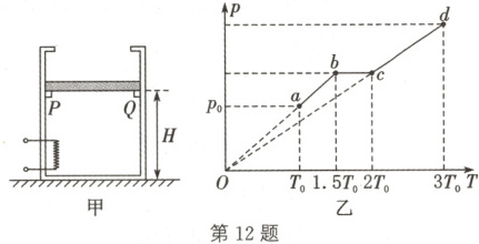 12. (选做题)(2025·四川成都质量调研)如图甲所示,绝热汽缸内用活塞封闭一定质量的理想气体,活塞可沿汽缸无摩擦滑动但不漏气,初始状态时封闭气体温度为 $T_0$,压强与外界大气压强相等,均为 $p_0$,此时活塞压在固定卡环 $PQ$ 上,距离汽缸底部的高度为 $H$。现通过电热丝缓慢对气体加热,最终活塞压紧在汽缸顶部的卡口上,此过程中气体压强 $p$ 随热力学温度 $T$ 变化的图像如图乙所示。已知汽缸横截面积为 $S$,汽缸壁厚度不计,重力加速度为 $g$。求: