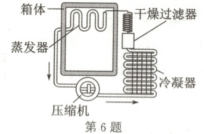 6. (2024·山西太原期末)如图所示为冰箱工作原理示意图。制冷剂在蒸发器中汽化吸收冰箱内的热量,经过冷凝器时液化,放出热量到冰箱外。下列选项正确的是 (
