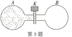 9. (2024·四川南充期末)气闸舱是载人航天器中供航天员进入太空或由太空返回时所使用的气密性装置,其原理图如图所示,座舱A与气闸舱B之间装有阀门K,座舱A中充满空气,气闸舱B内为真空。航天员从太空返回气闸舱时,打开阀门K,A中的气体进入B中,最终达到平衡。假设此过程中系统与外界没有热交换,舱内气体可视为理想气体,则 (