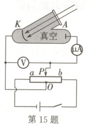 15. D 解析:要使微安表的示数恰好为零,光电管应接入反向电压,即K板电势高于A板电势,则滑片P应由图示位置向a端移动,选项A错误;根据$eU_{\mathrm{c}}=E_{\mathrm{k}}=h\nu - W_{0}$,可知不同频率的光子照射电极K,只要能发生光电效应,遏止电压是不同的,选项B错误;用最大光子能量为$12.09\ \mathrm{eV}$的光照射到光电管电极K上,当电压表的示数为$7\ \mathrm{V}$时,微安表的示数恰好为零,可知遏止电压为$7\ \mathrm{V}$,根据$eU_{\mathrm{c}}=E_{\mathrm{k}}=h\nu - W_{0}$,可得逸出功$W_{0}=h\nu - eU_{\mathrm{c}}=12.09\ \mathrm{eV}-7\ \mathrm{eV}=5.09\ \mathrm{eV}$,选项C错误;图示电压为零,未达到饱和电流,若从图示位置向b端滑动滑片P,正向电压增大,则微安表的读数可能会先增加后不变,选项D正确。
