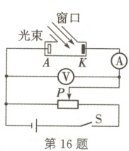 16. (2025·河南豫北六校联考)在研究光电效应现象时,某同学设计了如图所示的电路,第一次用波长为$\lambda$的光照射,调节$P$的位置,当电压表的示数为$U$时,电流表的示数刚好为零;第二次改用波长为$2\lambda$的光照射,调节$P$的位置,当电压表的示数为$\frac{U}{4}$时,电流表的示数刚好为零。已知普朗克常量为$h$,真空中的光速为$c$,下列说法正确的是