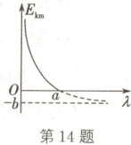 14. B 解析:由爱因斯坦光电效应方程得$E_{\mathrm{k}m}=\frac{hc}{\lambda}-W_{0}$,根据图像可知$W_{0}=b$,当$\lambda =a$时,$E_{\mathrm{k}m}=0$,得$W_{0}=\frac{hc}{a}$,联立解得$c=\frac{ab}{h}$,选项B正确。