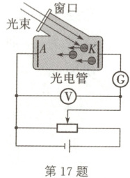 17. (2025·河北石家庄期中)研究光电效应规律的实验装置如图所示,光电管的阴极材料为金属钾,现用频率为$\nu$的单色光照射光电管,调节滑动变阻器滑片的位置,使光电流刚好为零,此时理想电压表的示数为$U_0$,普朗克常量为$h$,电子的电荷量为$e$。