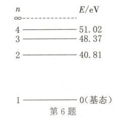 6.C 解析:根据题意可知,用能量为50eV的电子碰撞$He^{+}$离子,可使$He^{+}$离子跃迁到$n = 3$能级和$n = 2$能级,由$\Delta E = E_{m} - E_{n} = h\nu = h\frac{c}{\lambda}$可知,波长最长的谱线对应的跃迁为$n = 3 \rightarrow n = 2$能级,选项C正确。