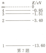 7.C 解析:氢原子从第1能级跃迁至最近的第2能级时吸收光子的能量$E_{1} = - 3.40eV - (- 13.60eV) = 10.2eV$,故高能级跃迁到第1能级放出的光子均为不可见光;而从高能级向第2能级跃迁时,放出的部分光子为可见光;从高能级向第3能级跃迁时,放出的光子为不可见光。所以至少要让氢原子激发到第3能级,最少应给氢原子提供的能量为$E = - 1.51eV - (- 13.60eV) = 12.09eV$,选项C正确。