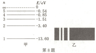 8.C 解析:由图乙可知产生的光谱线有3种,根据$C_{3}^{2} = 3$,可知氢原子吸收单色光的光子能量跃迁到$n = 3$,则这束光的光子能量$\Delta E = E_{3} - E_{1} = - 1.51eV - (- 13.6eV) = 12.09eV$,选项C正确。