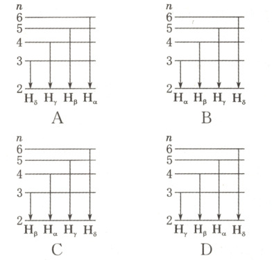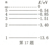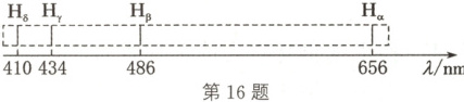 16.B 解析:由图可知,$H_{\alpha}$波长最长,则频率最小,能量最小,根据能级跃迁过程中能量关系有$\Delta E = E_{m} - E_{n}$,可知,$H_{\alpha}$是由第3能级跃迁到第2能级产生的,选项B正确。