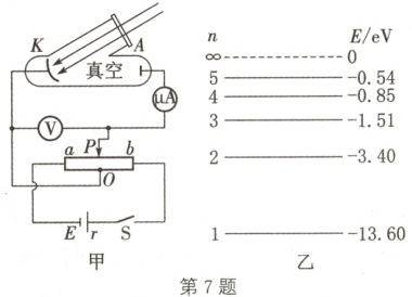 7. (2025·湖南长沙期中)已知氢原子的能级图如图乙所示,现用大量高能电子轰击一群处于基态的氢原子,轰击后可观测到氢原子发射不同波长的光有6种。利用氢原子发出的光照射某电路的$K$极,如图甲所示,发现电流表有示数,调节滑片$P$可使微安表示数减小到零,电极$K$由金属锌制成,其截止波长为$372\ nm$,普朗克常量取$6.6×10^{-34}\ J· s$,$1\ eV=1.6×10^{-19}\ J$。