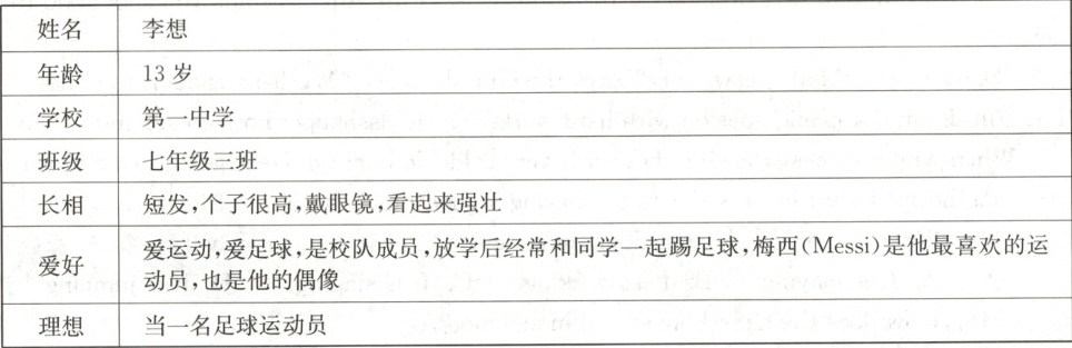 根据下表内容,用英语写一篇100词左右的短文,介绍你的朋友李想。
