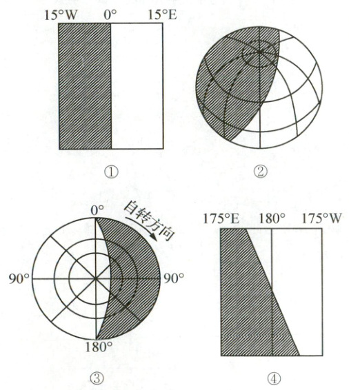 1. 这一天地球的光照图(阴影为黑夜,非阴影为白昼),可能是图中的(