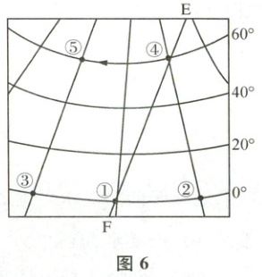 (2024 苏州阶段练习)图 6 中 EF 线是地球公转到 1 月初的晨昏线,箭头为地球自转方向,①点是东半球与西半球的分界线,②点位于东半球,①点与②③两点的最短距离是 3 330 km。读图完成 4~6 题。