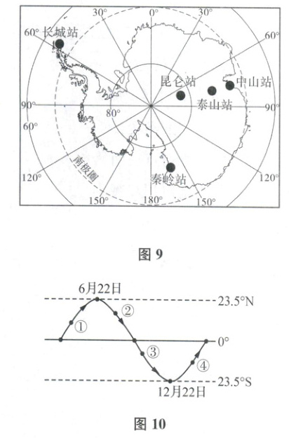 2024年2月7日,中国第五个南极考察站秦岭站开站。图9为“我国五个南极科考站分布示意图”,图10为“太阳直射点回归运动示意图”。据此完成4~5题。
