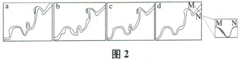 曲流发育的河段河道变化较为频繁且有规律可循。图2显示了黄河中游一段曲流20多年来河道的变化情况,该河段经历了裁弯取直的过程。读图完成3~4题。