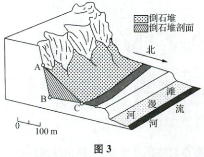 (2024南通期初)某半干旱区的一座砂岩山体于2023年7月发生崩塌,形成若干倒石堆(见图3),山体其他部位完好,ABC为倒石堆的剖面。据此完成5~7题。