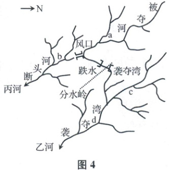 (2024常州一中阶段练习)河流袭夺是指分水岭一坡的河流夺取另一坡的河流上游水系的现象,是河系发展的一种现象,读图4、图5,完成8~10题。