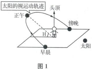材料一 太阳高度角,是我们观察太阳时的仰角,也就是太阳光线与地平面之间的夹角。 由于地球的自转,造成太阳的东升西落,太阳高度角在一日内不断发生变化(如图 1 所示);正午(地方时为 12 时)太阳位于上中天时,太阳的高度角达到一天中的最大值 H,我们将此时的太阳高度角称为该日的正午太阳高度。