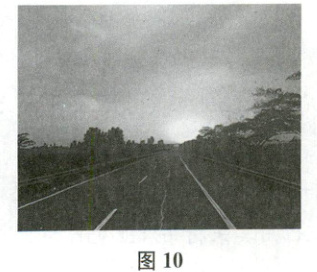 (2025 盐城七校联考)2024 年 5 月 1 日,王同学乘车经过南通$(32^{°}N,121^{°}E)$某路段时,恰好看到太阳从地平线升起。 图 10 为该时刻王同学拍摄的照片。 据此完成 1~2 题。