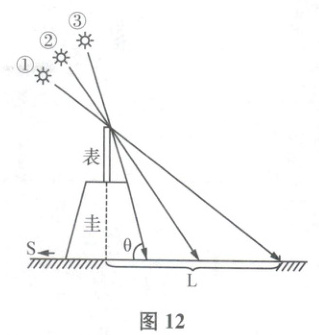 (2025 扬州期中)河南登封市古观星台$(34^{°}26^{'}N,113^{°}E)$院中的周公测景台,是我国古代用于观测日影的天文仪器,由表(直立的柱子)和圭(与表相连的石座)组成。 当太阳光照射在表上时,一年中仅有一天的正午时刻地面上没有表的影子。 图 11 为“周公测景台景观图”,图 12 为“二分二至日正午周公测景台光照示意图”。 据此完成 6~8 题。