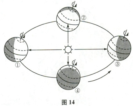 (1)图13中,自转的方向为逆时针,说明是北半球;北极圈及其以北地区出现了极昼现象,说明太阳直射点的位置是北回归线,正值北半球夏至节气。结合所学知识可知,图14中①为夏至日,②为春分日,③为冬至日,④为秋分日,故地球位于图14中①位置。