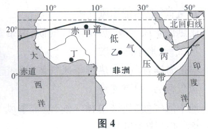(2024 常州期中)受太阳直射点移动及下垫面状况影响,全球气压带、风带的位置与范围会发生改变。图 4 示意非洲局部地区某月赤道低气压带的分布。据此完成 8~10 题。