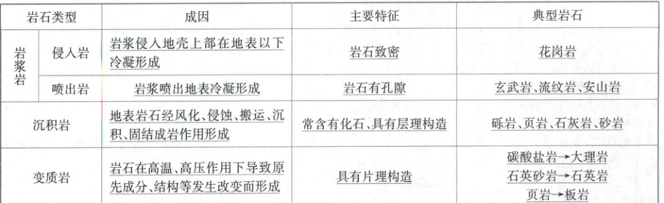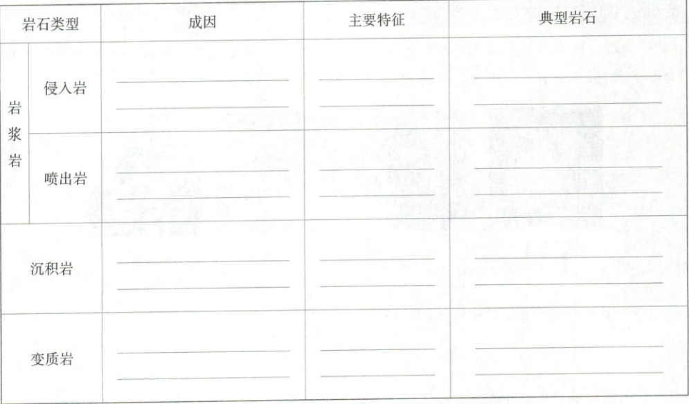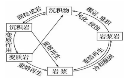 材料一 在地球内部压力的作用下,岩浆沿着岩石圈的薄弱地带侵入岩石圈的上部或喷出地表,冷却凝固形成岩浆岩;裸露在地表的岩石经过风化、侵蚀、搬运、沉积及固结成岩作用,形成沉积岩;由于温度、压力等岩石存在条件产生变化,导致岩石原先的结构、矿物成分发生变化,形成变质岩;岩石在地球内部经过重熔再生作用,又形成新的岩浆,形成岩石圈的物质循环。