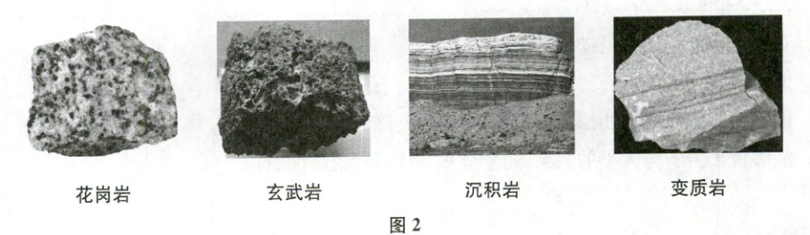 材料二 按照岩石的成因,岩石可分为岩浆岩(火成岩)、沉积岩和变质岩。图2为一些典型岩石的照片。