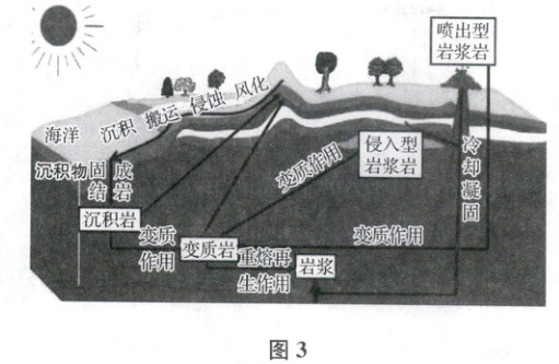 材料二 图3为“岩石圈物质循环示意图”。