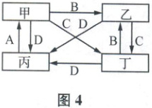 2. 图4为“岩石圈物质循环示意图”(甲、乙、丙、丁分别代表岩浆和三大类岩石,A、B、C、D分别代表地质作用过程,乙为沉积岩),结合图3,准确判断岩石类型和地质作用。