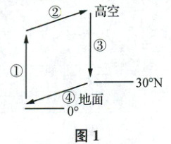 1. A ①位于赤道,太阳高度角大,受太阳辐射多,气温高,该处大气受热膨胀上升,A正确;受地转偏向力影响,②为高空中的偏西风,B错误;③处大气受重力作用而下沉,C错误;④为北半球的信风带,应为东北信风带,D错误。故选A。
