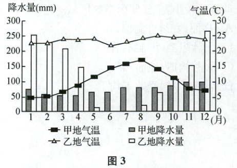 (2025扬州开学考)图3为“甲、乙两地气候资料图”。读图完成5~6题。