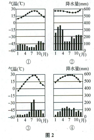(2024镇江期末)图2为“四种气候类型的气温与降水月分配图”。读图完成3~4题。