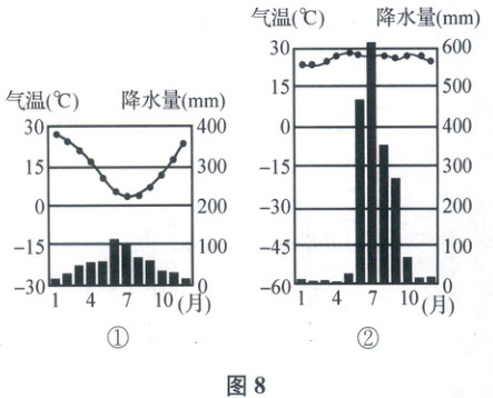 (填字母)。(4) 图8中,①地点气候类型与图7中