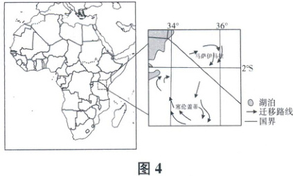 (2025宿迁中学月考)在非洲坦桑尼亚的塞伦盖蒂和肯尼亚的马萨伊马拉之间,每年都会出现壮观的动物大迁徙。图4示意野生食草动物迁徙路线。据此完成7~8题。