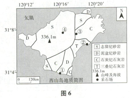 (2025 无锡期中)太湖石是我国观赏名石之一,形状各异,多有孔洞,其孔洞形成机制与喀斯特溶洞相似。部分太湖石经历波浪长期侵蚀而形成品质更优的“水石”。太湖中心的西山岛自唐代以来就是太湖石的主产地。图6为“西山岛地质简图”。据此完成1~3题。