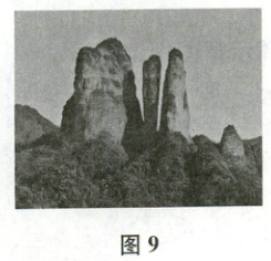 (2025 南通月考)江郎山位于浙江省江山市西南部,主要岩层由紫色块状砾岩与砂砾岩组成。图9为“江郎山‘三月石’景观图”,图10为“地壳物质循环简图”。据此完成6~8题。